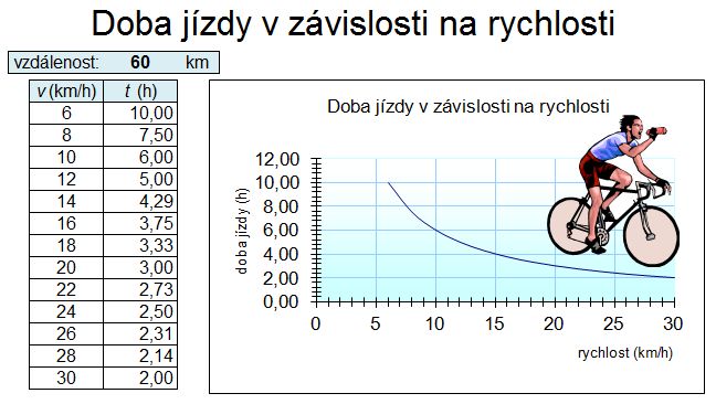 Pokus se v tabulkovém procesoru vytvořit tabulku, která pro zadanou vzdálenost (musí být možnost toto číslo měnit) vyjádří dobu jízdy cyklisty v závislosti na jeho rychlosti. Tuto závislost znázorni vhodným typem grafu. Příklad řešení je znázorněn na obrázku: