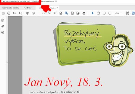 Na webu https://msr.vsb.cz/kombinatorika-pravdepodobnost-a-statistika/statistika najdeš tři testy (a také tři párovací hry, které ale nejsou součástí úkolu). Pokud zašleš snímky obrazovky se svým výsledkem (pouze bezchybným), získáš za každý úspěšně splněný test plus do celkového hodnocení. Do snímku obrazovky uveď svoje jméno a datum řešení. Ze snímku musí být patrné (viz červená šipka v obrázku), o který test se jedná. Prvních pět úspěšných řešitelů získá plus navíc :)